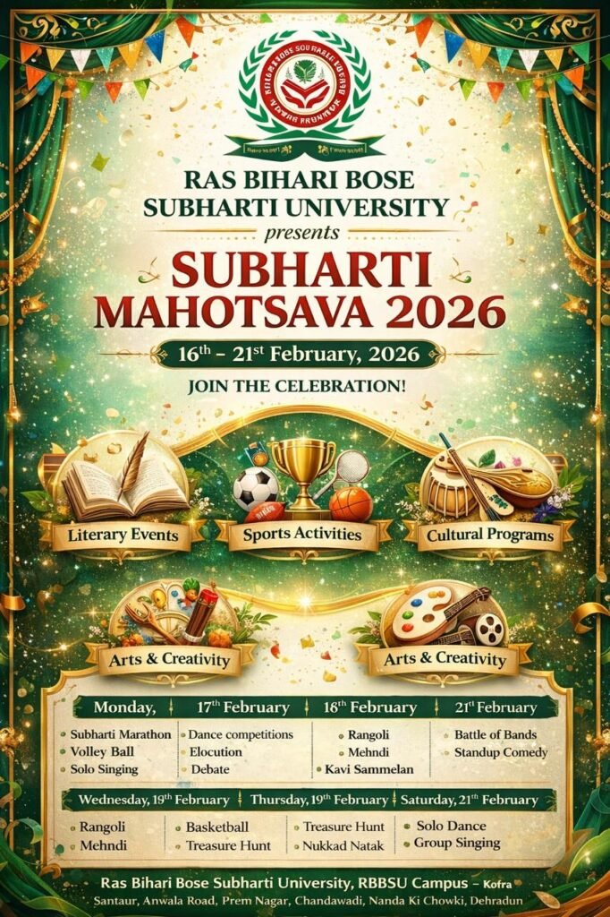 *February 16–21: Subharti Mahotsav 2026, the flagship annual festival of Ras Bihari Bose Subharti University, will be held from February 16 to 21, 2026. The grand celebration aims to foster creativity, competitive spirit, and holistic personality development among students. Through a vibrant blend of literary, sports, artistic, and cultural activities, the university campus will provide a dynamic platform for students to showcase their talents.
